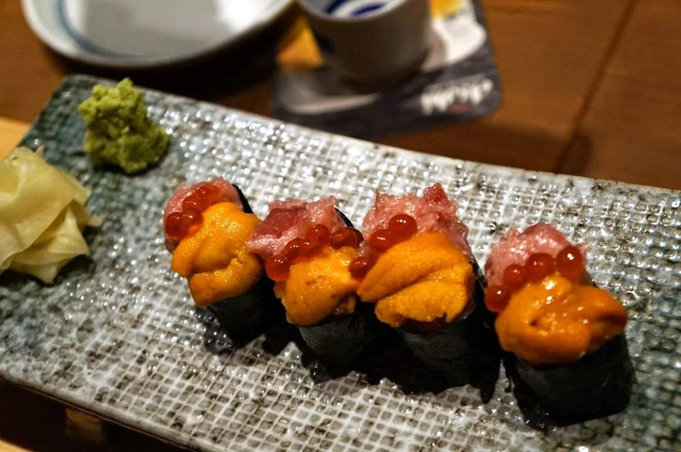 A delicious combination of fatty tuna, salmon roe and urchin.